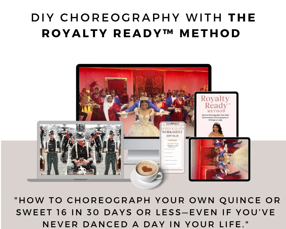 Get the complete Royalty Ready™ System, including the step-by-step Ebook and the Official Quince & Sweet 16 Planner. This powerful combo provides everything you need to choreograph a jaw-dropping event, eliminate planning stress, and confidently create a celebration that turns heads and melts hearts.
